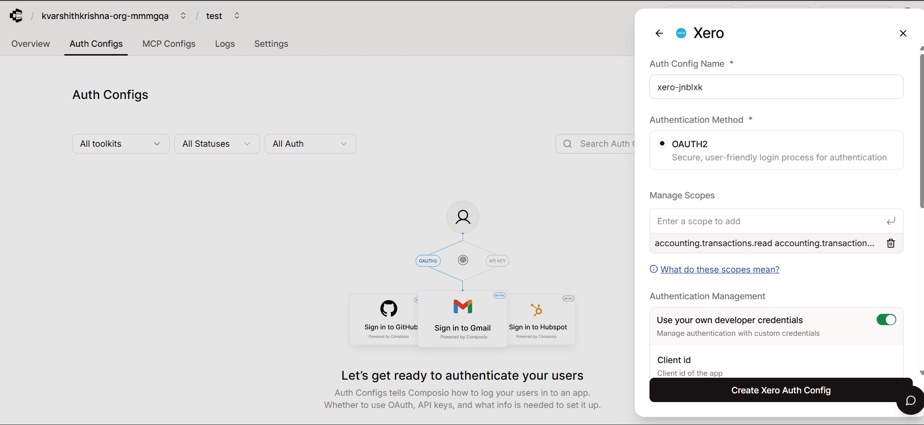 Once you have the auth config for Xero set up, go to the Manage Auth Config tab, where you can fill in the auth config fields.