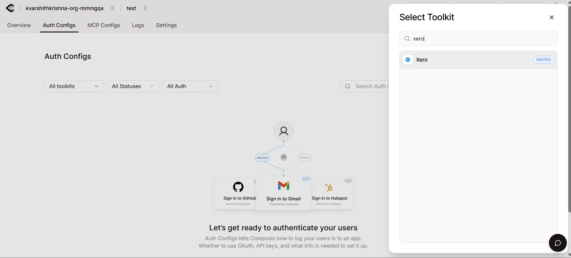 With your OAuth credentials ready, navigate to the Composio dashboard to configure the authentication settings for Xero.